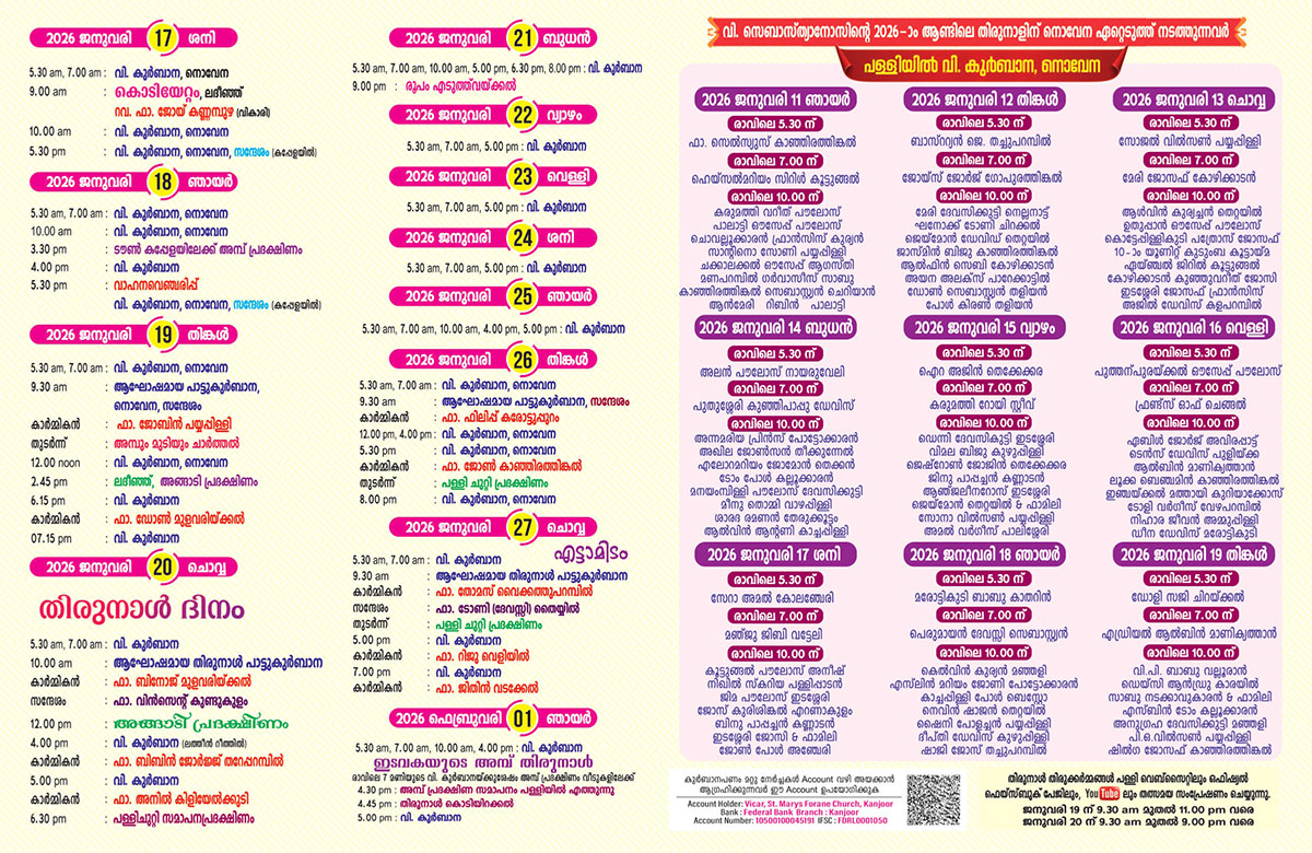 The pilgrims flock to this sacred place throughout the year and particularly during the festival season in January. Every year from 10 to 27 of January, thou¬sands of people belonging to all religions reach Kanjoor to celebrate the feast of the St.Sebastian. The days of solemn celebration are 18th, 19th and 20th of January. The Eighth - Day of the feast is celebrated on 26th and 27th of January. The biggest 3 festival processions in South India are held on 19th and 20th of January. People suffering from incurable and chronic diseases, epidemics and shattering problems of life visit the church for deliverance and relief. Major offerings made by those who seek the intercession of the Kanjoor Punnyavan are Ambum villum ezhunnullikkal, kazhunnu, oil offering, adima, vedi vazhipadu, floral decoration, offering gold and silver.Cordial and Warm welcome to Kanjoor to experience the Christian heritage and the divine presence of St. Sebastian...